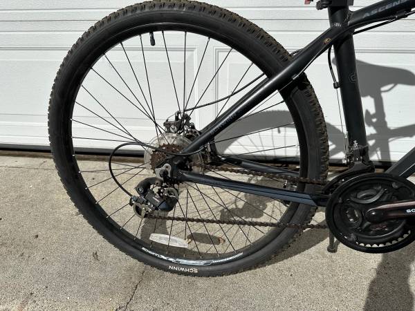 The bicycle is Schwinn Ascension 29, it is a mountain and street bicycle with seven speeds and mechanical disc brakes. It has an adjustable seat and handlebars for comfort. The bike has Schwinn suspension fork for riding on tough trails with front shocks. It also has 7 speed shifter (RevoShift & RevoShift FRICTION). Cash only in person.