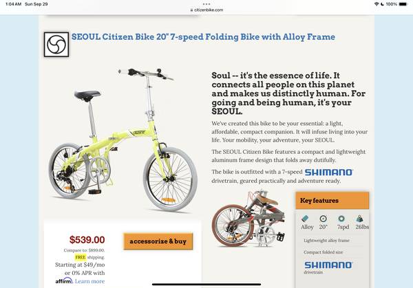 Citizen created this bike to be your essential: a light, affordable, compact companion. It will infuse living into your life. Your mobility, your adventure, your SEOUL.