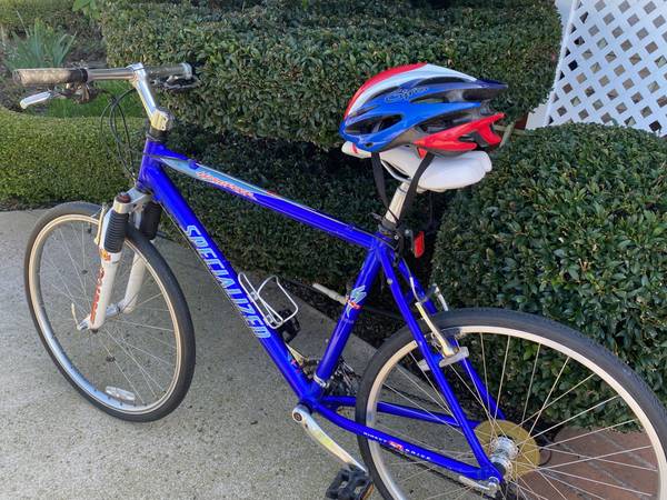 For sale good condition 19" specialized Hardrock hybrid bike and Giro helmet , 21 speeds , 19" aluminum frame .