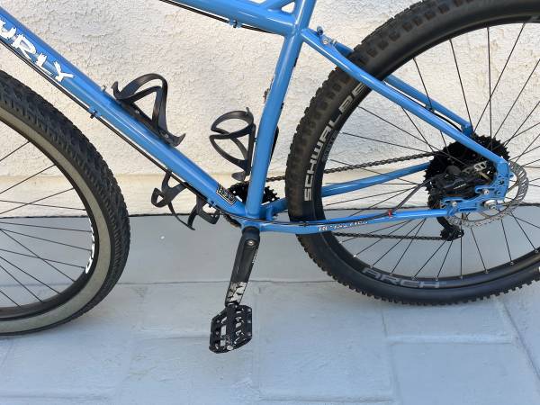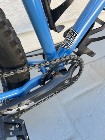 Size Medium, easy riding 4130 ChroMoly steel frame. Every part is clean, no scratches, and in great working condition (chain, brakes, etc.). Includes VP flat pedals, 3 water bottle cages, and slightly upgraded saddle (cro-mo rails). Shimano Deore M6000 1x10 cassette, (11-42), 32T chainwheel, Tektro hydraulic discs. Note that I replaced the rear wheel with a Stan's NoTube Arch and Schwalbe Nobby Nic tire in January, and changed everything over to tubeless. Other specs as shown in photo. Almost all the miles on this bike are on the Aliso Creek trail, sometimes with grand children. I bought this bike to replace a skinny tire road bike; I'm 75 and admitting my age...going electric. Cash only. Thanks for your interest.