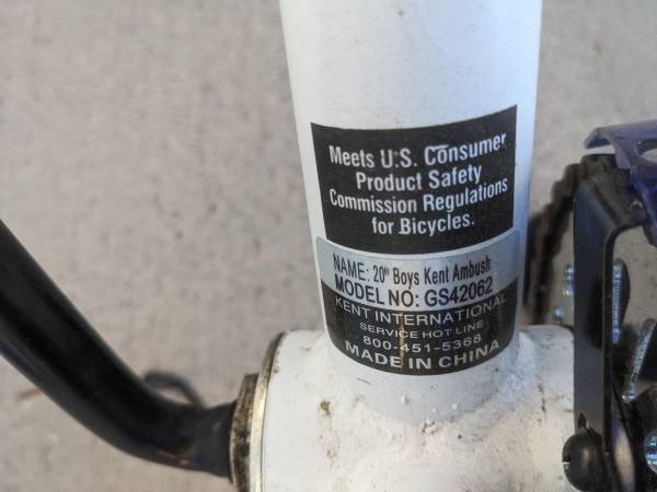20" Kid Bicycle Name: Kent Ambush FS20 Model: GS42062 Caliper and reverse pedal brakes Crack in chain protector, otherwise in good used condition, normal dirt and scratches.