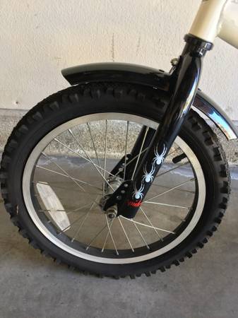 My son never used and it's been hanging in the garage. When you see it, you'll know. I will include the never worn helmet (gift from grandma) and training wheels too.