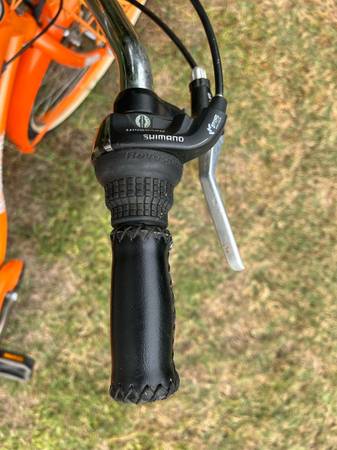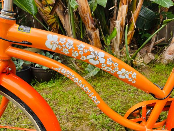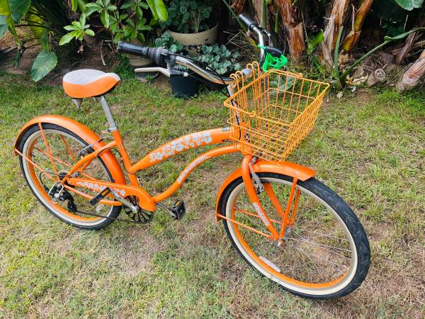 Girls / ladies awesome Aloha beach cruiser. Aluminum frame, seven speed with hand brakes. Strong and lightweight leather hand grips matching basket. In perfect condition. Fenders, adjustable seat...