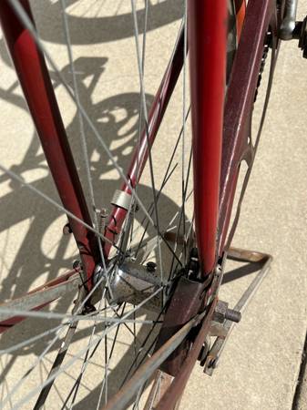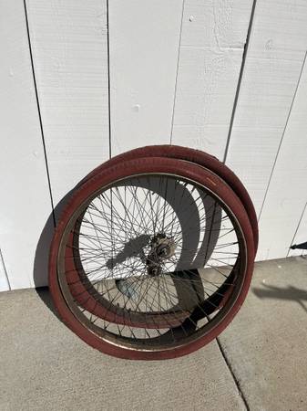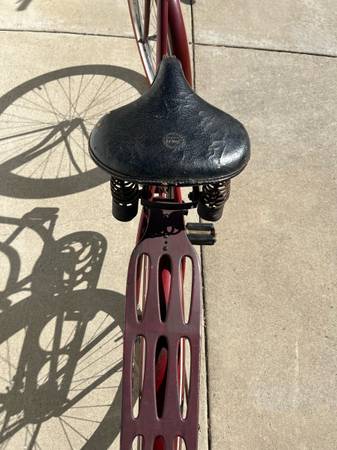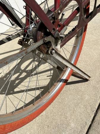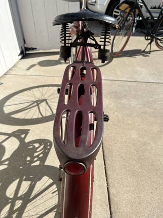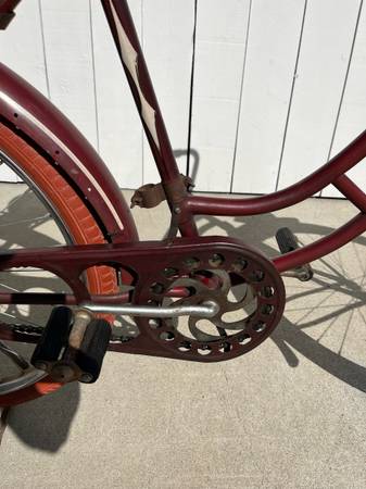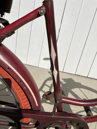 The paint on this beauty is incredible for age. Not a dent. Everything is original except the wheels- I have the original brick red tires- pictured. Holes in rear fender for the skirt guard and there’s a clamp for pump. Needs plastic lens for light. This bike is well preserved and a real head turner.