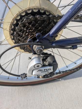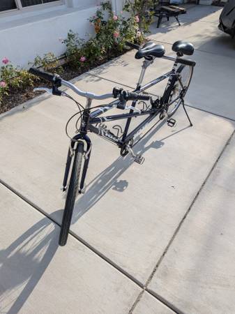 Very lightly used KHS tandem bicycle--20 years old but only ridden occasionally (less than 25 miles in 20 years!). Very comfortable to ride and maneuver. Shimano components. Suspension rear seatpost...