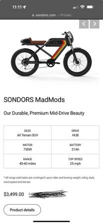 Selling my Sondors MadMod Café Racer Electric Bike – It's a beast and so much fun to ride! Definitely the coolest looking ebike there is. I get compliments ever time I ride it. It’s in great condition. New price Paid $3300!