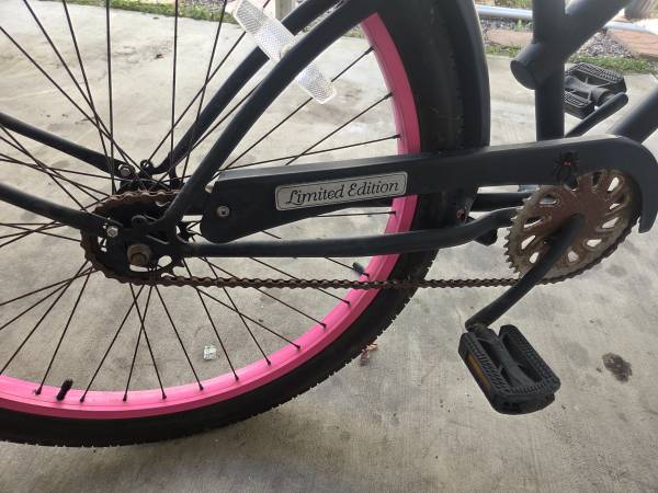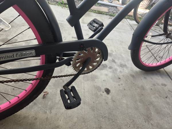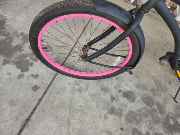 Selling a Women's Beach Cruiser in flat black with pink rims. It features a custom pedal-forward ergonomic frame. The bike has a single-speed coaster brake for simplicity and reliability. It rolls...