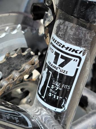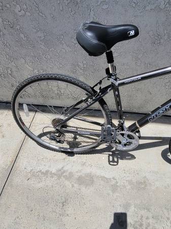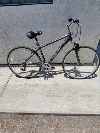 The Nishiki Men's Montour Hybrid Bike will provide you comfort during long and bumpy rides. The soft foam saddle with a suspension seat post and coil spring will absorb the shock of the trails. The heat-treated butted 6061 alloy frame and steel headset, stem and handlebar make this bike a durable riding machine. Frame size is 17"/medium.