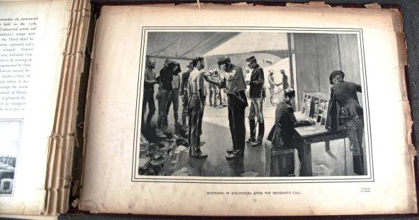 Peter Fenelon Collier.. Fair with no dust jacket. 1898. First Edition; First Printing. Hardcover. Large book with many black and white plates and color plates of the war. Cover is worn and soiled and some pages have foxing. Scarce first edition. Revolts against Spanish rule had been endemic for decades in Cuba and were closely watched by Americans. There had been war scares before, as in the Virginius Affair in 1873. By 1897-98, American public opinion grew angrier at reports of Spanish atrocities in Cuba. After the mysterious sinking of the American battleship Maine in Havana harbor, political pressures from the Democratic Party pushed the administration of Republican President William McKinley into a war he had wished to avoid.[8] Compromise proved impossible, resulting in the United States sending an ultimatum to Spain demanding it immediately surrender control of Cuba, which the Spanish rejected. First Madrid, then Washington, formally declared war.[9]; Photos and Illustrations; Large Folio .