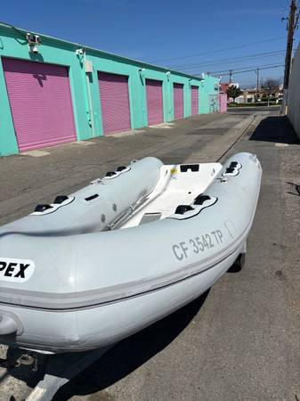 I have one new Apex A-11 double hulls with bow locker, Hypalon rib. This boats is a top quality boat with an excellent ride and superior Hypalon quality. They make an excellent open rib or you can add a seat and console and they make an excellent console boat a well. Offered at a discounted price. This is a 15" transom boat. Rated for up to a 20 hp outboard max. ( no trailer included)