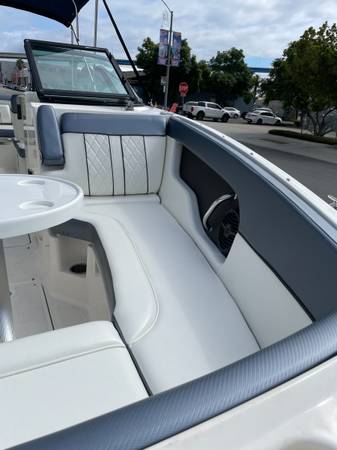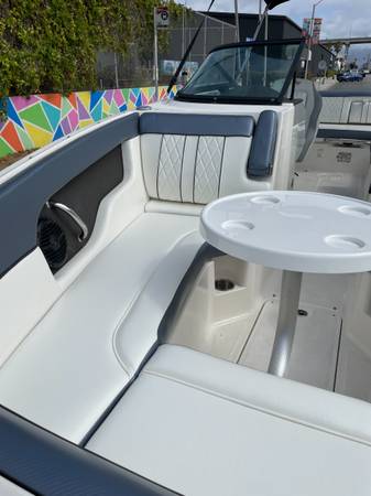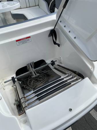 Other Features: Deep bow seating with storage, manual/submersible swim step, cockpit table, bimini top,