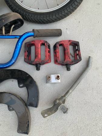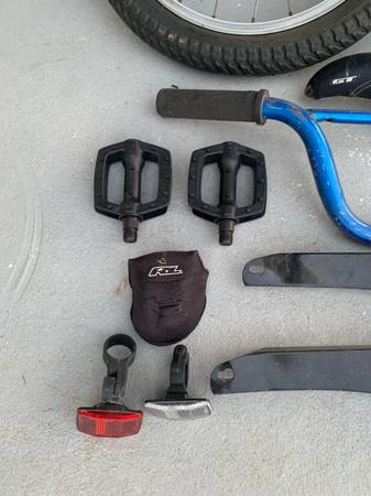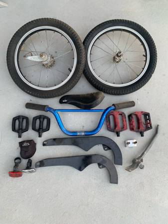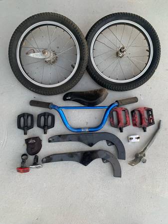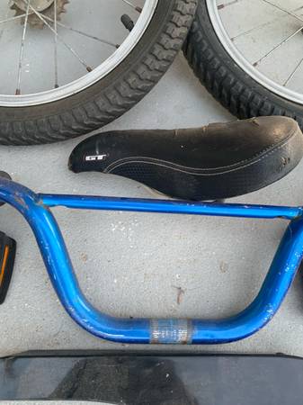 $39 For All As Pictured. 16” HJC Wheels and Tires, Handle Bars, GT Seat (some tears), Pedals, Reflectors, GT Chain Guards, Misc Bolts From Different Vintage GT Bikes Over the Years.