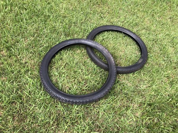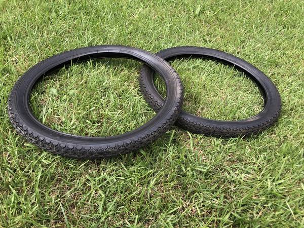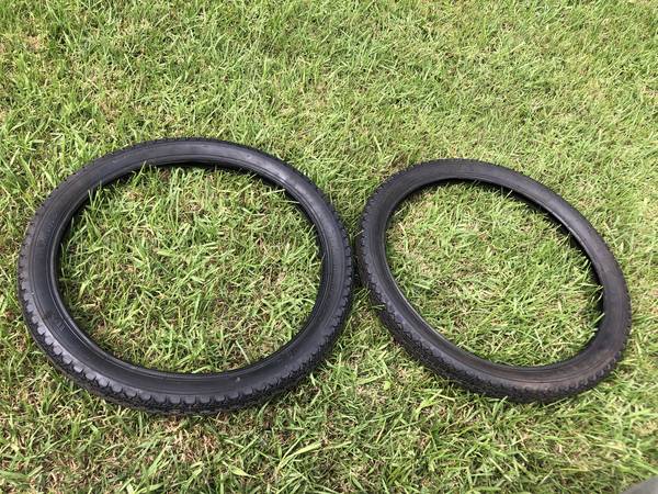For Sale here is a brand new pair of 20" BMX Bicycle tires. These were taken off a new electric bike conversion that I built and wanted whitewall tires on it instead. The bike was a 20" Kid's Cruiser bicycle. They still have all the new molding teats and markings. These are marked 57-406 & 20 X 2.125 size for standard size 20" bicycle rims. I build quite a few electric bike conversions and end up with a small pile of brand new take off parts, wheel assemblies, new Blackwell tires (I like whitewall tires) and often switch out handlebars and related parts. I am starting to list these new parts at good prices so I can get rid of a few things. I also have quite a few brand new 24" & 20" front wheel assemblies as well as new tire sets that I will be listing soon. Thanks for looking.