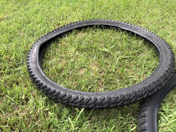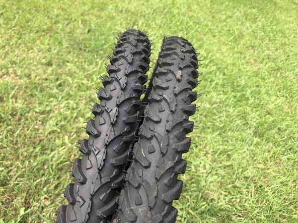 For Sale here is a brand new pair of 24" Mountain Bike tires. These were taken off a new electric bike conversion that I built and wanted whitewall tires on it instead. They still have all the new molding teats and markings. These are marked 50-507 & 24 X 1.95 size for standard size 24" bicycle rims. I build quite a few electric bike conversions and end up with a small pile of brand new take off parts, wheel assemblies, new Blackwell tires (I like whitewall tires) and often switch out handlebars and related parts. I am starting to list these new parts at good prices so I can get rid of a few things. I also have quite a few brand new 24" & 20" front wheel assemblies as well as new tire sets that I will be listing soon. Thanks for looking.