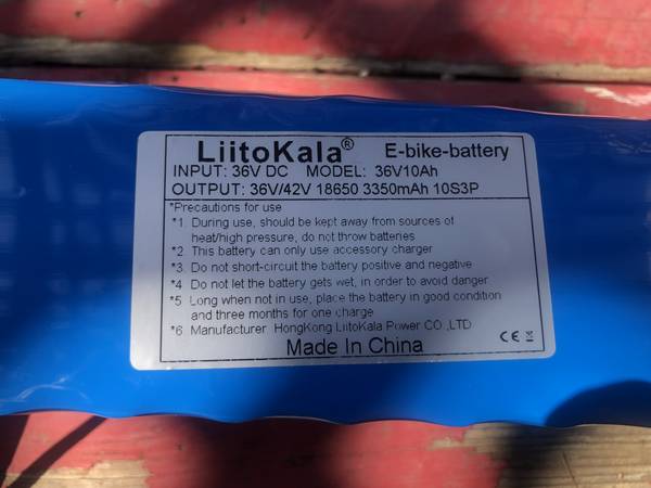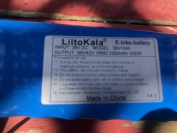 For Sale here is a link new LiitoKala electric bike 36 volt battery with a total capacity of 10 Amp Hours. This battery came off an electric bike I built for a friend who only used it a few times. He just upgraded to a new controller and 48 volt setup. I just tested the battery with my meter and is putting out 41.8 volts which is near 100% new capacity. I don't remember the BMS it has onboard but I suspect it's a 20 Amp. This includes a soft battery mounting bag with velcro straps and also a 36 Volt 2 Amp battery charger.