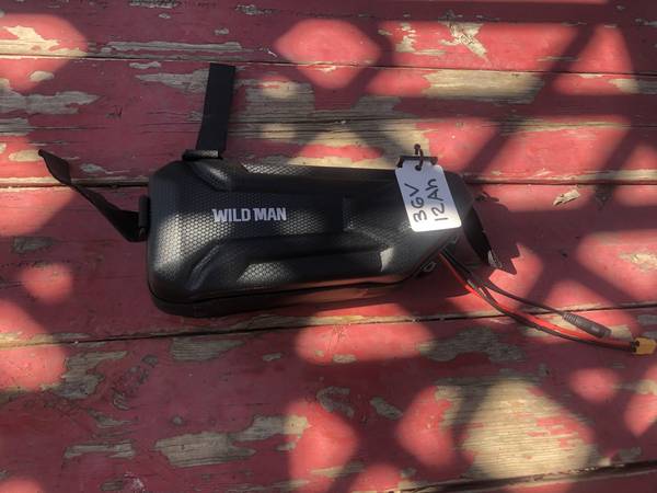 For sale here is a like new 36 Volt electric bike Lithium Ion battery pack and a 36 volt 2 Amp battery charger. This comes in a sturdy soft case with velcro mounting straps marked "Wildman". The capacity of this battery is a 12 Amp Hour and it's only been used a few times on testing my eBike conversions that I build.