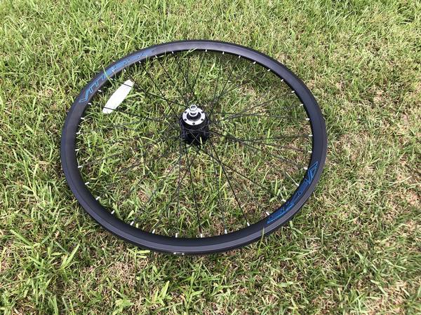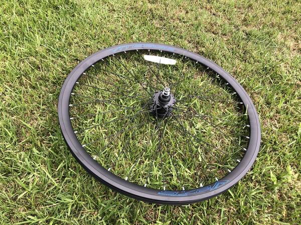 For Sale here is a brand new front wheel assembly that came off of a 27.5" Mountain Bike with a front disc brake. It has a nice black finish on the rim. I mounted an electric bike front wheel motor kit and mounted the disc on the motor hub so this new wheel was never ridden. I build quite a few electric bike conversions and end up with a small pile of brand new take off parts, wheel assemblies, new Blackwell tires (I like whitewall tires) and often switch out handlebars and related parts. I am starting to list these new parts at good prices so I can get rid of a few things. I also have quite a few brand new 24" & 20" front wheel assemblies as well as new tire sets that I will be listing soon. Thanks for looking.