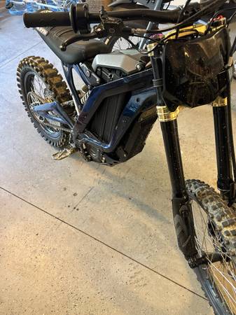 Surron LBX with upgraded RFloXa front fork suspension, Guts seat, blue powder coat, and Dunlop/Flow wheels rear tire.