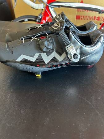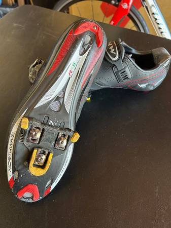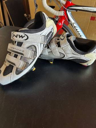 Cycling shoes with spd cleats. Brand of all is Northwave and all have carbon fiber plate. 1.: All black with speed lacing system, and Air Flow system. Model is Extreme Ultralite. Size 46. Very Good condition. New inserts included. $15. Pairs # 2,3, and 4: Model of each is Aerlite. All size 45.5. Standard ratchet or strap buckle system. $5 each pair. Set of shoe toe covers: $5.