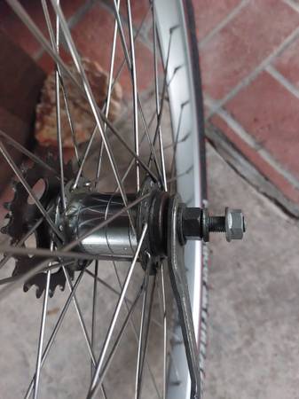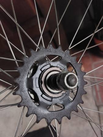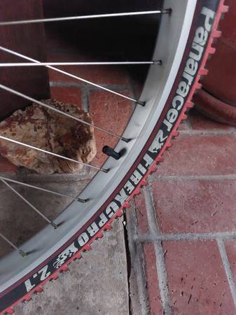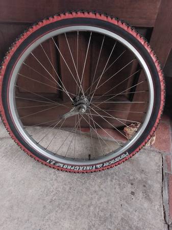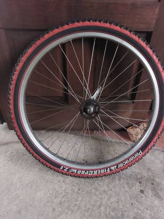 This used 26" rear wheel includes wheel and 2 matching Panaracer mtb tires, and thorn-resistant tube . Very Straight and true and strong. 22 tooth cog. Absolutely zero rust. Pickup only. Text me if...