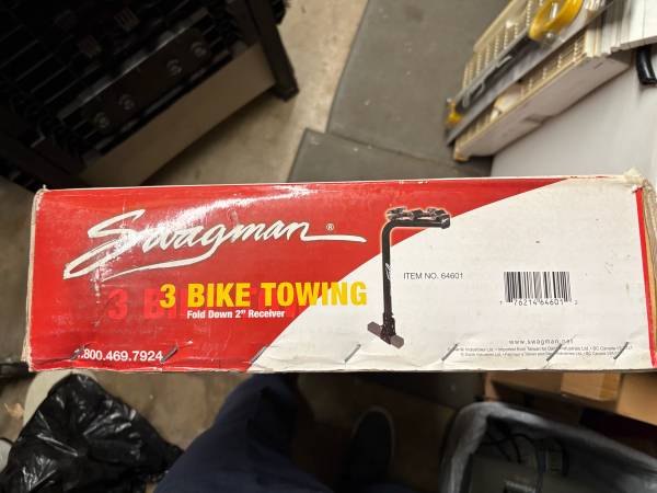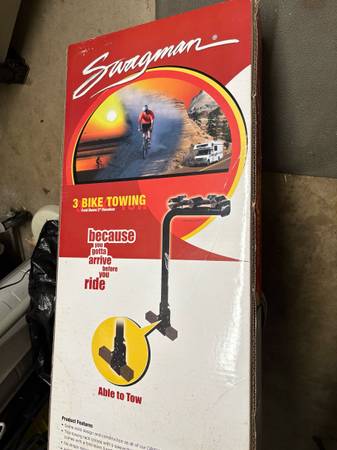 Unopened Swagman 3-bike towing hitch. Fold-down 2” receiver. Great deal! Bought at Camping World, never used and waited too long to return.