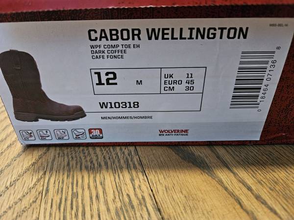 Men's Wolverine Cabor EPX Waterproof Composite Toe Wellington Boot W10318 Dark Coffee 12M. Brand new in box. Never used or worn. Box has some shelf wear.