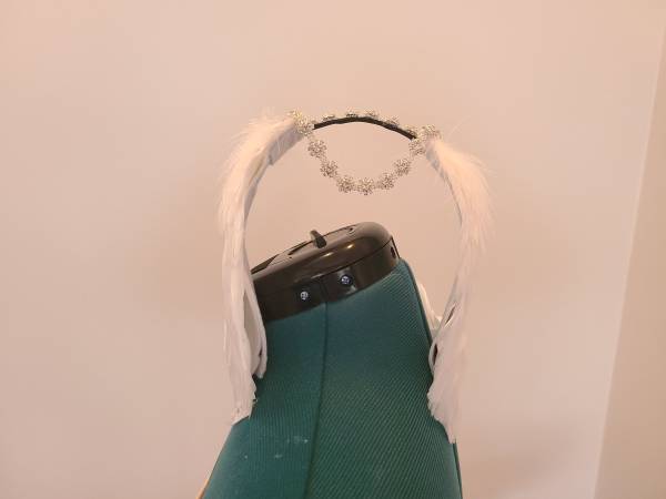 I purchased this from Amazon to use for a Swan Lake costume. It is really cool but opted to go with something a little smaller. Never used other than to try on. Has 2 alligator clips to hold in...