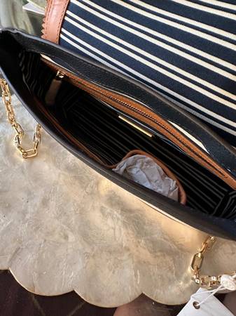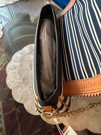 Brand New with Tags Excellent Condition Blue and white striped Inside zipper and side pockets Snap closure Gold chain adjustable shoulder strap Cash only