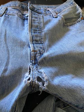 2 pairs of 501 jeans button fly 36x29 Both pairs have holes in the crotch area See images 25 for the pair Great for repurposing the denim , lots of fabric to work with Pick up today