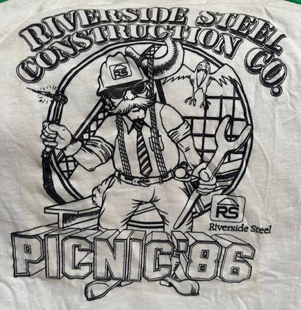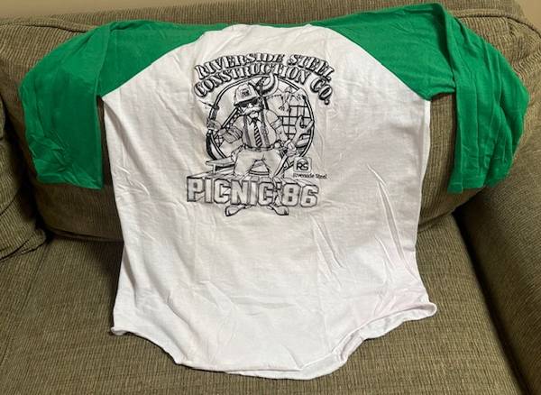 LIKE NEW!!!!!!1986 Riverside Steel Annual Picnic 3/4 Sleeve Baseball Softball Shirt Have XL and L- one of each in mint condition. 39 years old!! $20 EACH. These were stored indoors in a closet since they were obtained. I'm selling these on behalf of a friend's widow. The Deceased friend WORKED FOR RIVERSIDE STEEL. Please click on the link to see my other items. PLEASE, no emails..............click the "REPLY" button for my phone number and TEXT TEXT TEXT TEXT TEXT TEXT Mark. Thank you very much. This can be picked up near Harbor Blvd. and Chapman Ave. in Fullerton. I can mail them for an additional $10. Thank you very much.