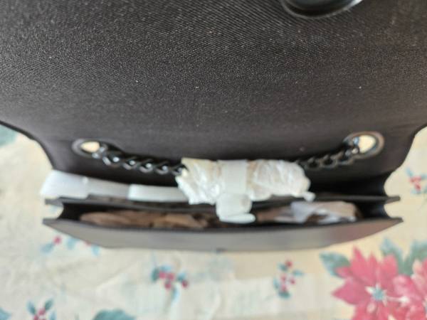 Synthetic material, adjustable chain strap, 2 compartments, Magnetic snap closure, bag measures 12" wide x 7.5" high and 4.5" deep. Weight 31.75 ounces.