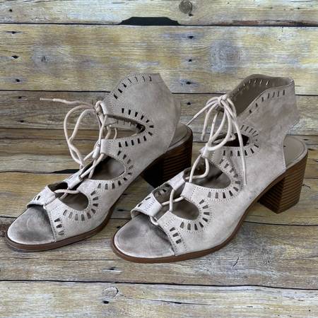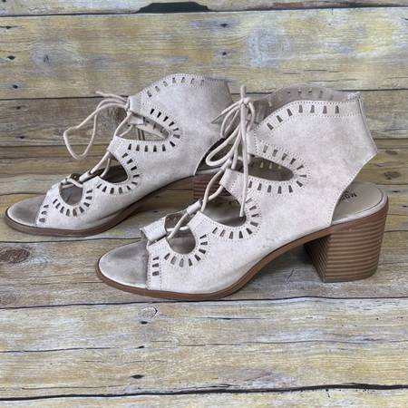 These sandals feature a light-colored, faux suede-material with laser-cut details in Tan Color
