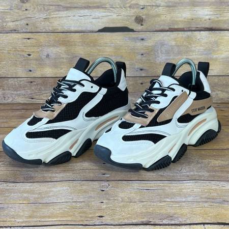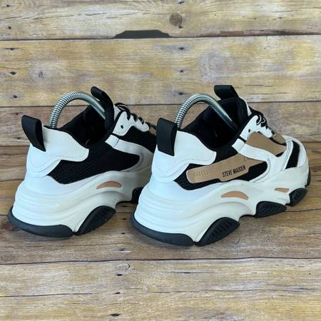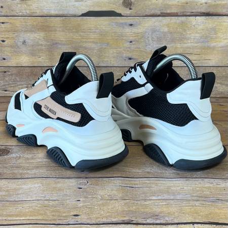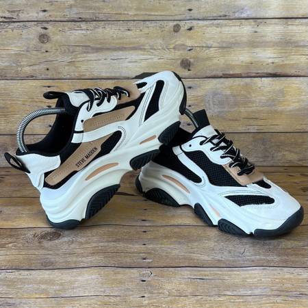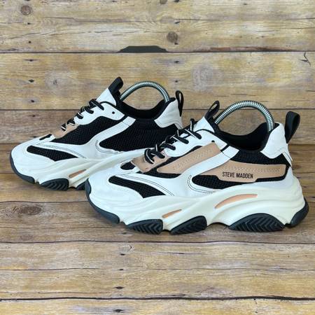 The Steve Madden Women's Possession Platform Sneaker in the Bright Multi color, size 8M, is a popular chunky-style fashion sneaker that features a vibrant, multicolor fabric upper.