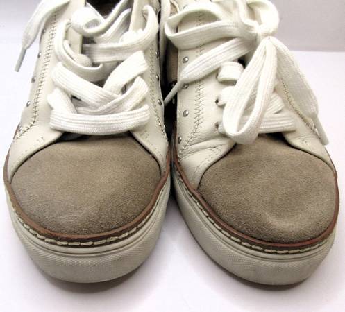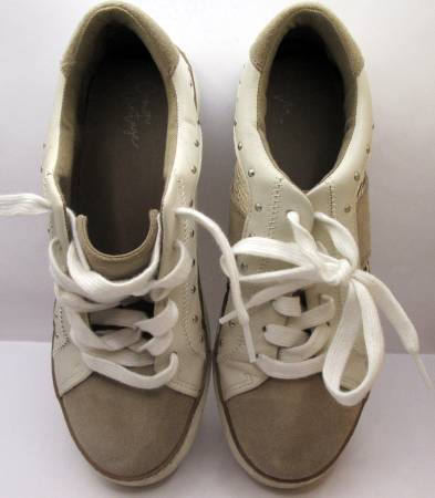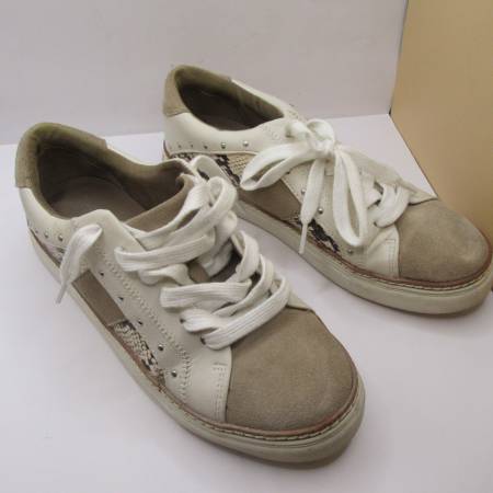 For sale are a lightly used pair of Crown Vintage Kalinda Tan shoes, which are part of the Crown Vintage brand by Designer Brands Inc., also known for the Designer Shoe Warehouse (DSW) store chain. These shoes feature a suede toe, leather body, and snake print accent on the side, complemented by white laces and silver stud detailing. The Crown Vintage brand has collaborated with Emma Roberts for collections available at DSW.
