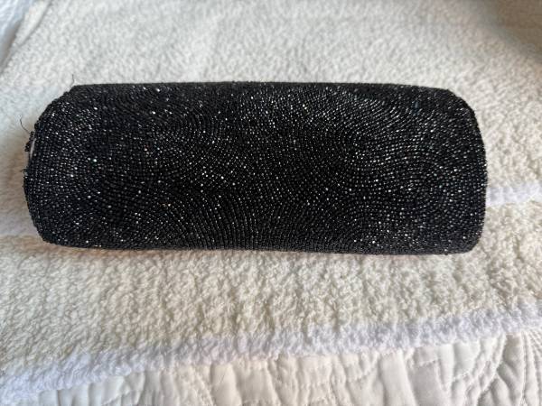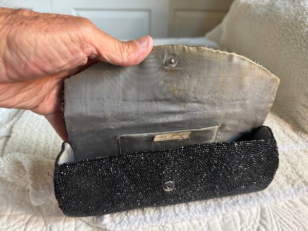This is a hand beaded bag by Josef from Belgium. This is a very elegant clutch type bag with black luminous beads. Circa late 1950’s.