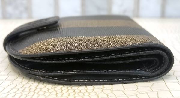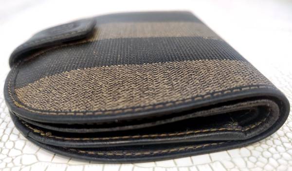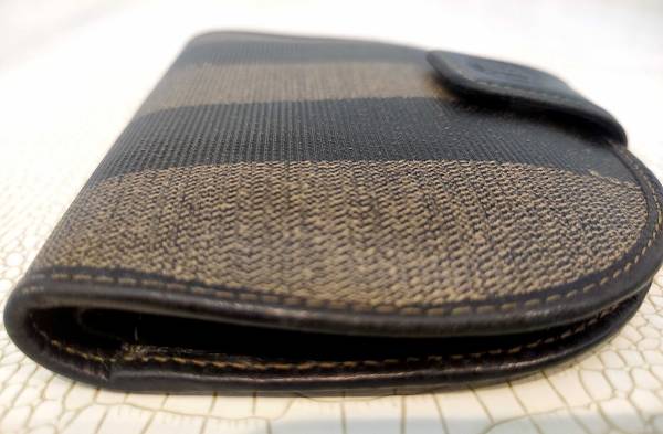 This beautiful 100% authentic women's Fendi Pequin snap wallet features a striped black design made from leather with the Fendi logo accent. It is a vintage piece from Italy, showcasing high-quality craftsmanship. The wallet is one size and includes credit card slots and a folding design, making it practical for everyday use. This stylish accessory is perfect for women who appreciate luxury and timeless fashion pieces.