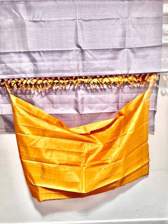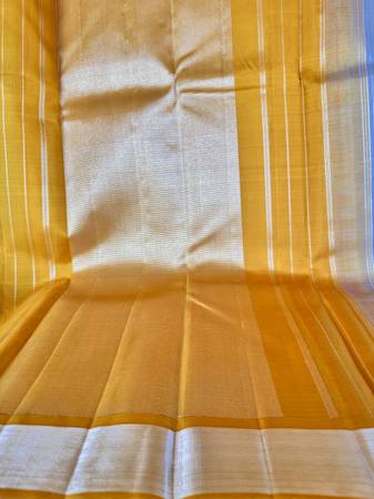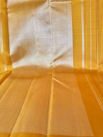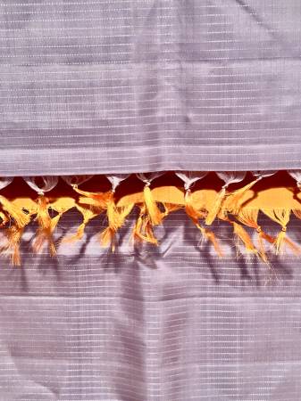 The delicate interplay of dilver and gold stripes adds a timeless charm, while the border and edges bring a grounding touch to its elegance. The border, meticulously woven in classic design tells a story of tradition and modernity, exquisitely.