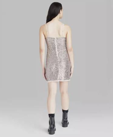 Sequin slip dress with a v-neckline and lace trim accents. Made from 100% recycled plastic, the dress is 96% nylon and 4% spandex for comfortable wear that moves with you. Tailored in a mini length silhouette, it features adjustable straps with a back zipper for a nice fit.
