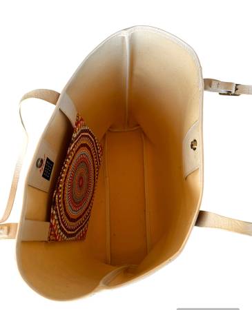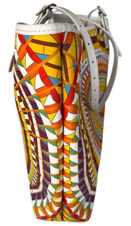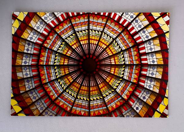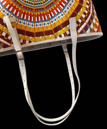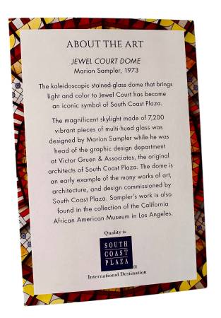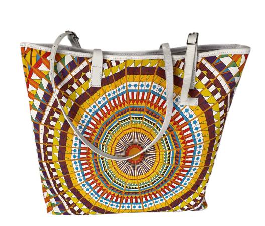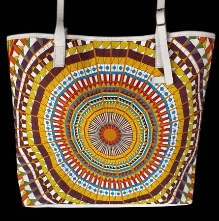 Leather snd canvas shell is printed all over in the kaleidoscopic stained glass dome that brings light and color to the jewel court, an iconic symbol of south coast plaza in Orange County.