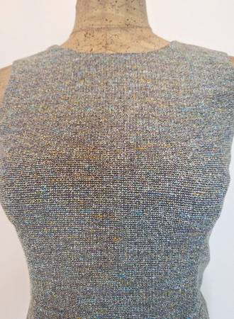 This ISABEL ARDEE dress suit was made exclusively for Neiman Marcus. The suit is made from a lightweight textured tweed fabric in shades of gray, blue, and yellow. It features a fitted jacket with a notched collar, button-down closure, and welt pockets. The jacket's silhouette pairs effortlessly with the matching sheath dress.