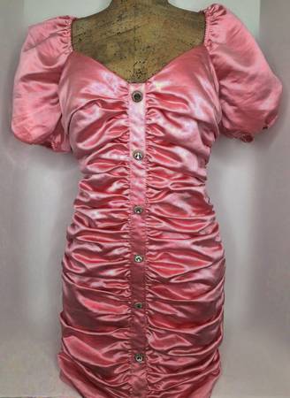 Mini bodycon dress with a sweetheart neckline. Made of shiny, satin fabric that is fully lined. Features short, puffy sleeves, ruching throughout the bodice and skirt, and decorative jewel buttons...