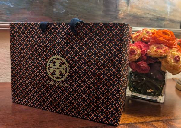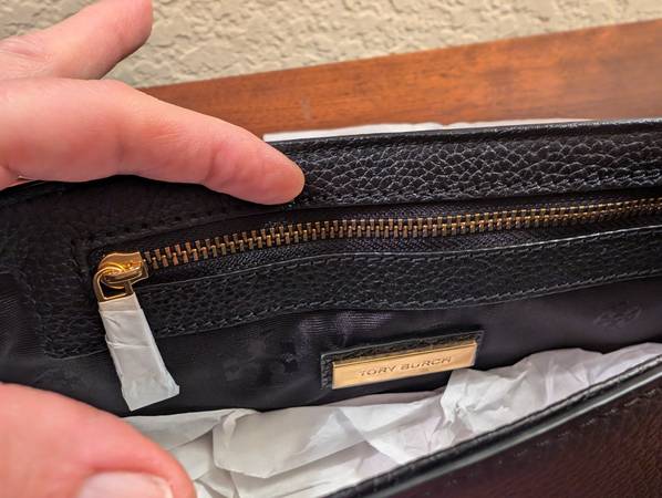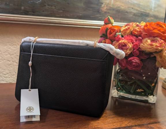 New, still in bag, Tory Burch Britten black adjustable bag with gold logo.