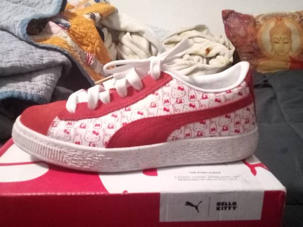 PUMA x Hello Kitty Suede Classic sneakers, which were released as part of a capsule collection in 2018 to celebrate the 50th anniversary of the PUMA Suede silhouette.The shoes feature a bright red suede on the toebox, tongue, heel, and Formstripe, set against a white Hello Kitty pattern.