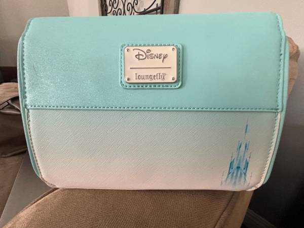 NEW WITH TAGS AND STILL PACKAGED. This bag is an officially licensed Disney product. Disney Elsa Snowflake Glitter Crossbody Bag. Shades of light blue and glitter sparkle. Elsa even leaves her mark on the front clasp, which is covered by a silver snowflake. On the back, you’ll find Elsa’s Ice Palace, shimmering against a light background.