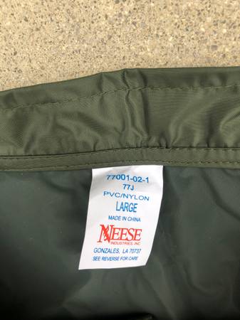 Like new condition. Men's rainwear, raincoat and matching rain trousers by Neese. Easy fit over clothes. Great for outdoor jobs in rainy weather. $20 cash for the set.