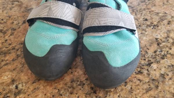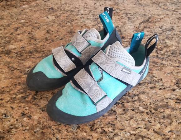Scarpa Origin Climbing shoes Womens 8.5 Mens 7.5 EU40 in nice light green suede leather with the Vision rubber outsoles. Barely used and show almost no wear, super clean. These are nice quality Climbing shoes, made in Italy