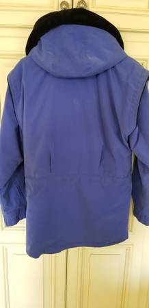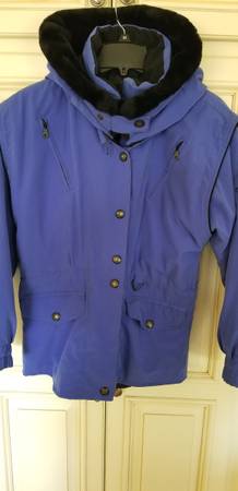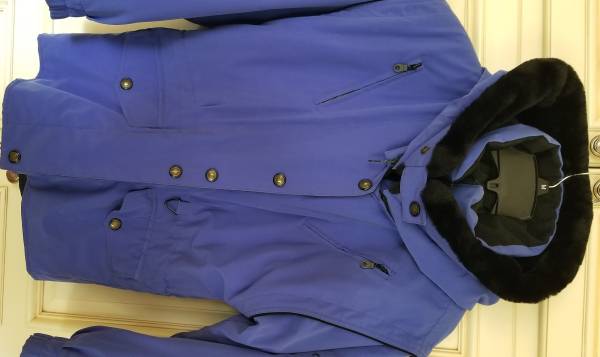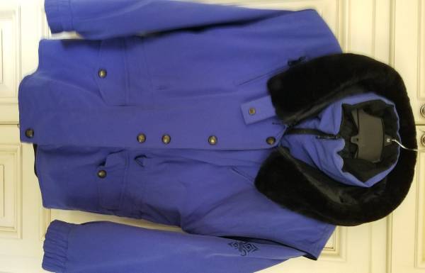 This is a very nice winter jacket in royal blue with black trim and faux fur. The removable hood is quilted with a snap closure. It is in excellent condition with no tears or stains.