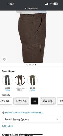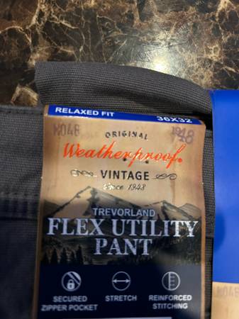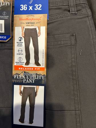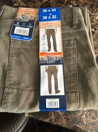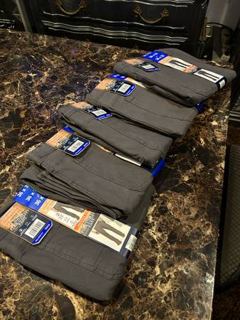 These pants are nice I bought so many because I figured since they are such nice material quality stitched with 5 pockets but I bought a little too many for my dressers.I’ll part with 5 of them for 25 firm each as that’s half cost .size is Men’s 36 waist and 32 length . If the ad is up we have them in Mission Viejo new never worn .Charcoal Grey and weatherproof as well as comfortable.