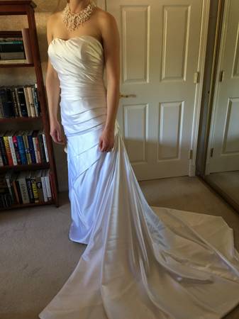 Strapless, mermaid style, white satin, chapel train, size 10 Model is 5'9" and 135 lbs. Never used - purchased as a backup!