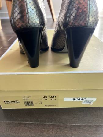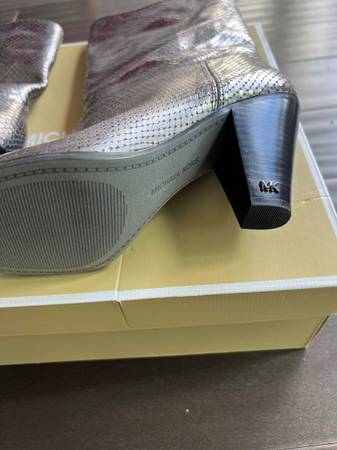 MICHAEL Michael Kors ladies DIVIA BOOTIE in diamond-embossed metallic calf leather are pull-on style. They are mid calf in shaft height with a block heel. These will be your party favorite. The color is called ANTHRACITE. It's actually a metallic aluminum silver color.
